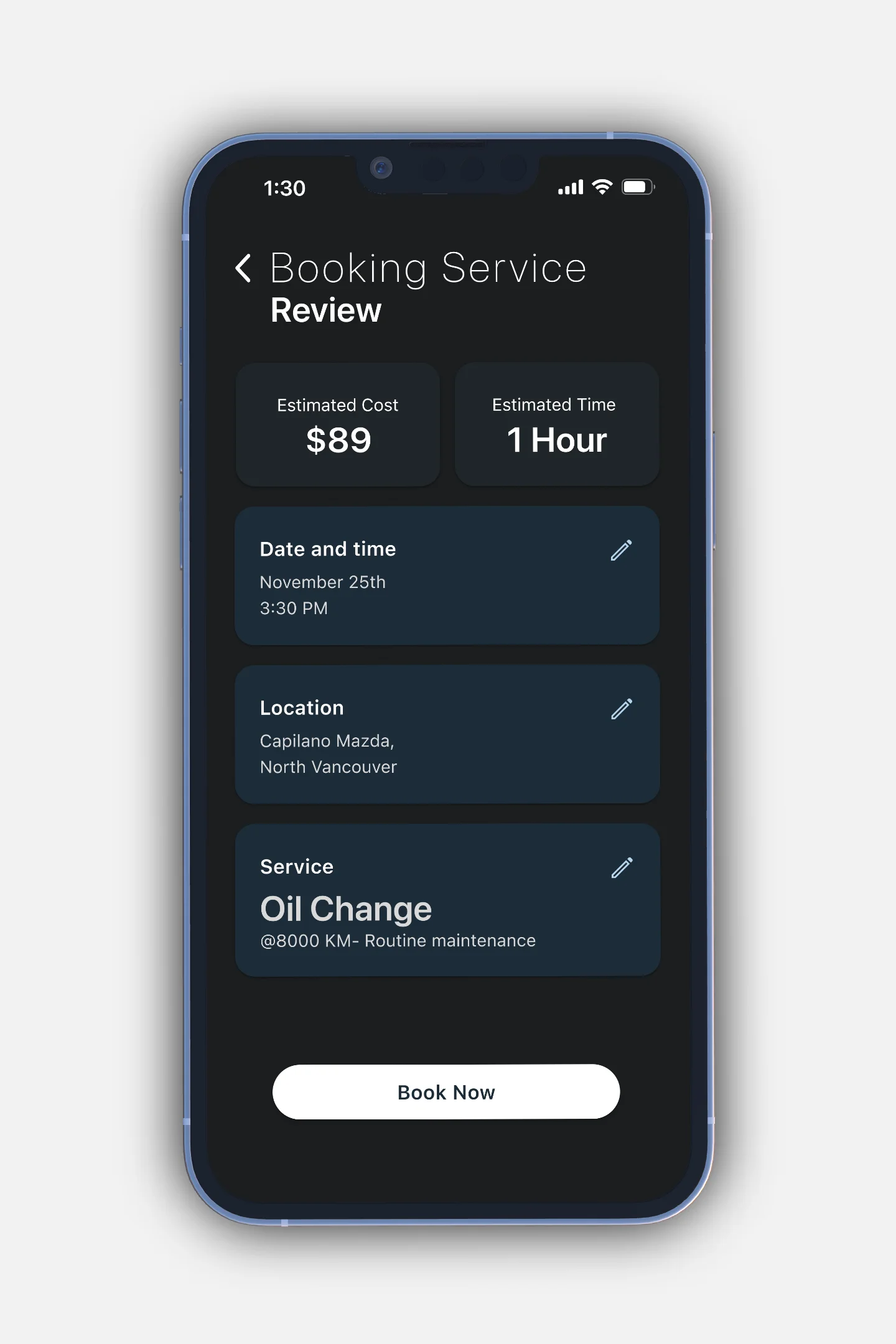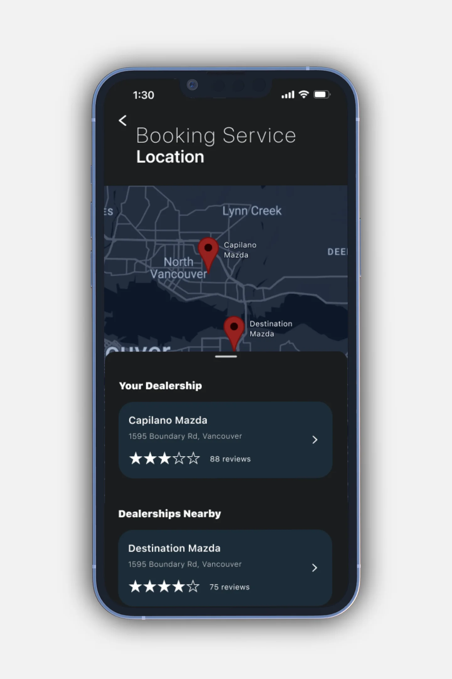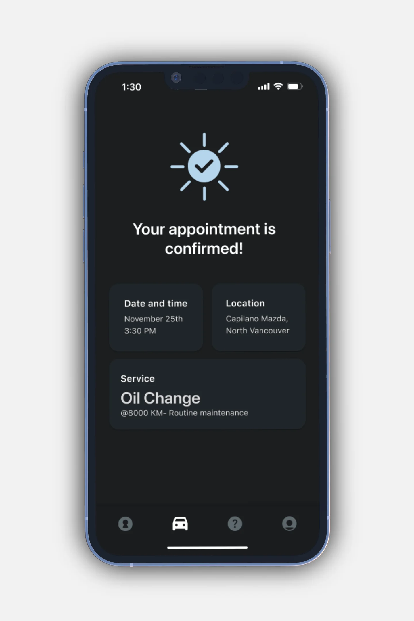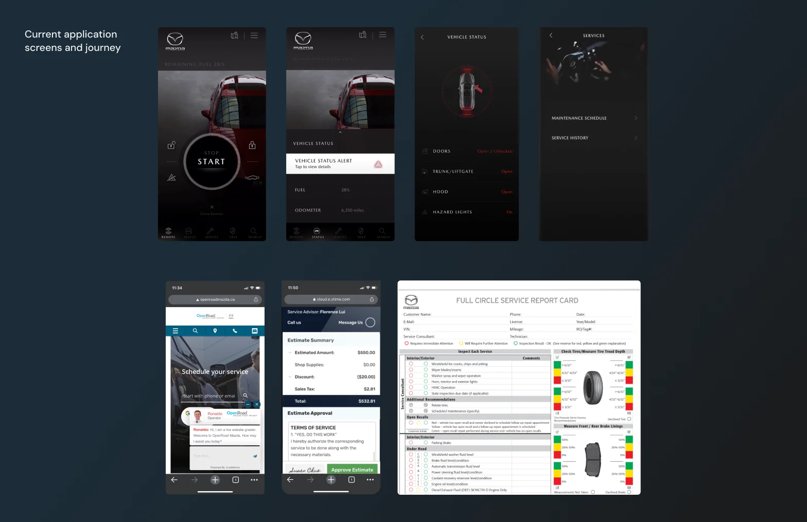 Currently, the app allows owners to control and monitor their vehicle and offers functions such as starting their car, checking the status of their vehicle, and booking maintenance and repair appointments through a third-party web page. However, our interviews showed multiple gaps in the experience where owners were frequently taken in and out of the Mazda branded touchpoints and brought to 3rd party services.