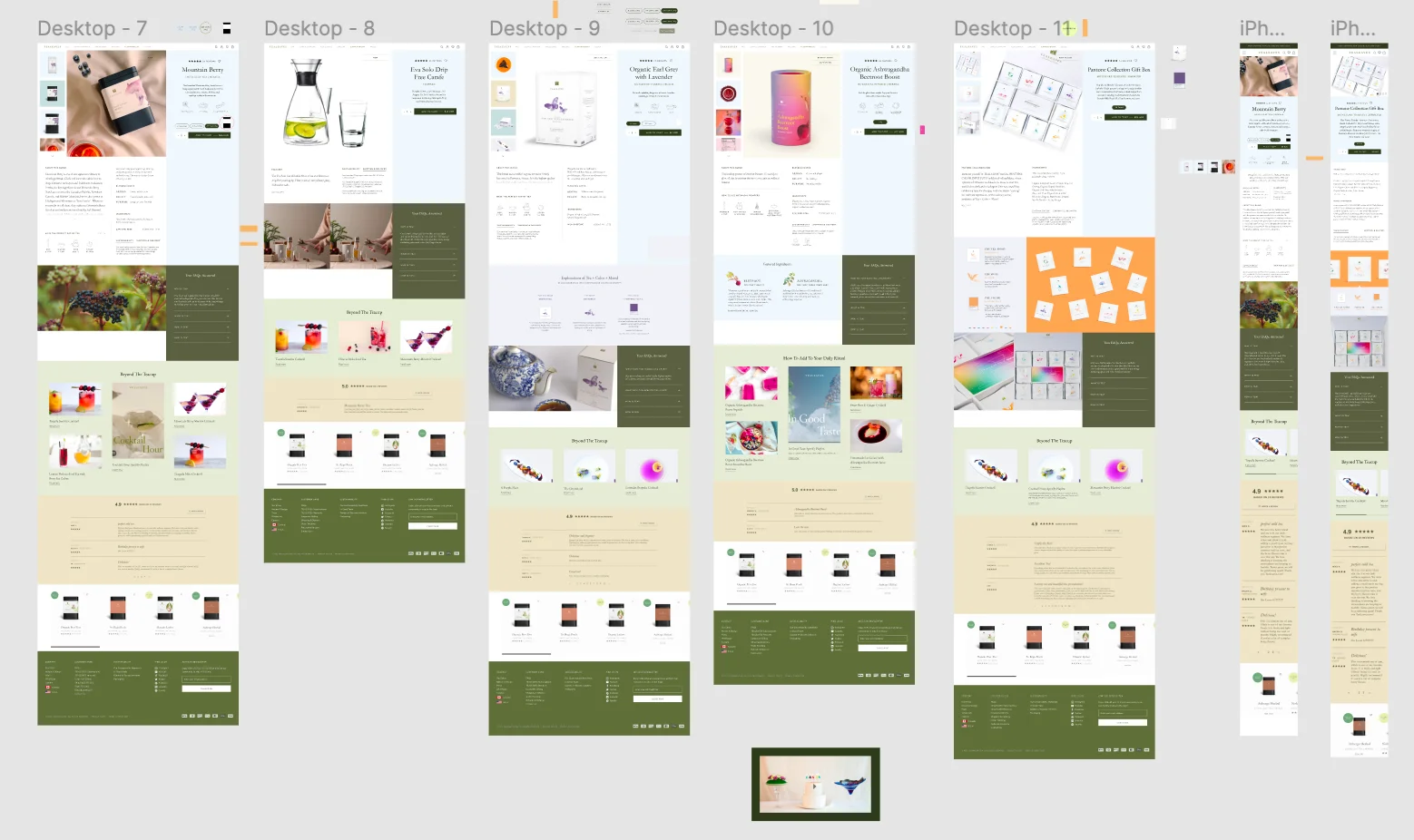 This ranged from regular tea blends to big gift boxes and gift cards. Each type of product needed to include a photo, price, CTA button and short description. For these elements I conducted a series of sketches from thumbnail sketches to higher fidelity ones on Figma.