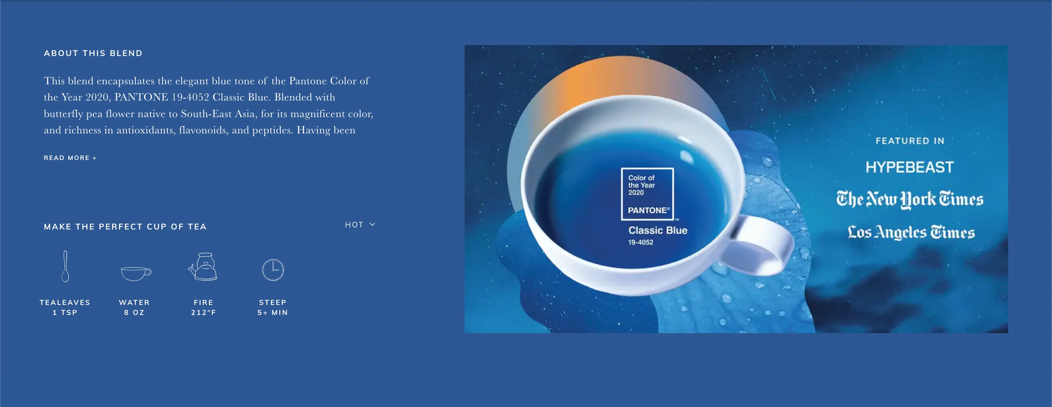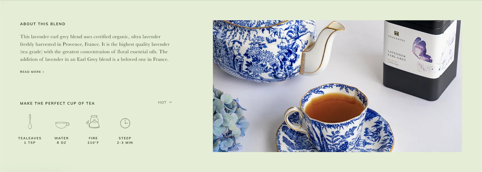 The final result of this project was a successful redesign and overhaul of the product pages that allowed for easier readability, and further scrolling. Each product page is able to be customized with videos, images, icons, articles, and recipes which encourage further exploration of the TEALEAVES brand.